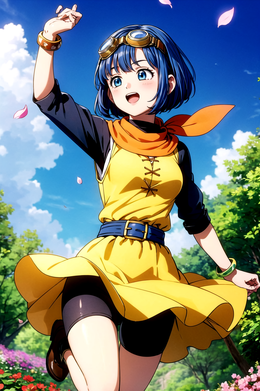 ・DQ10 costume(yellow dress, orange scarf, black sleeves, blue belt, bracelet, bare hands, black bike shorts, boots, )