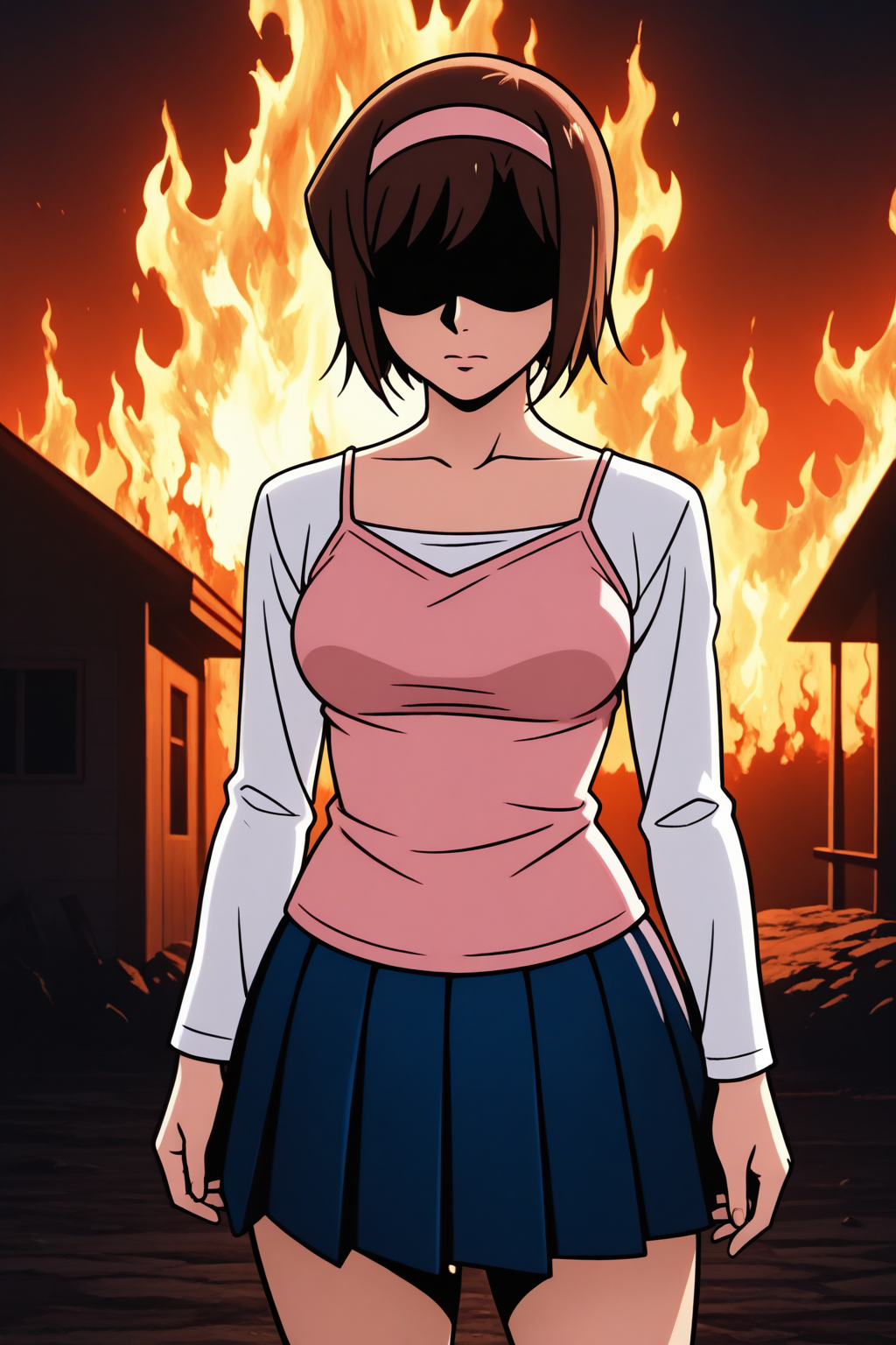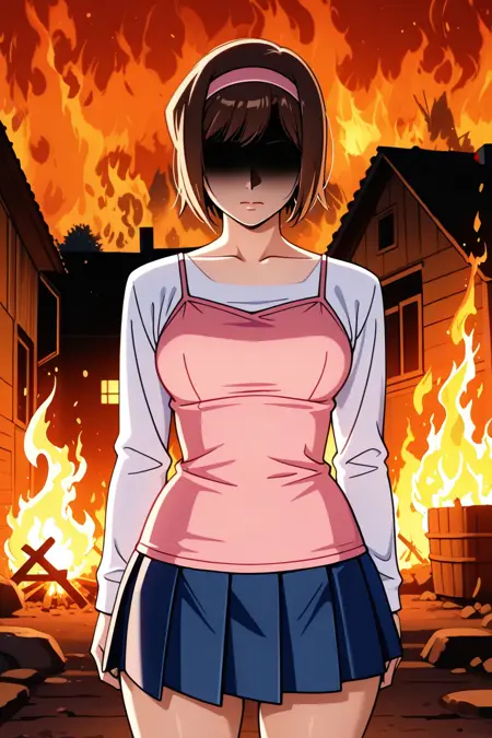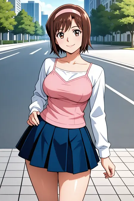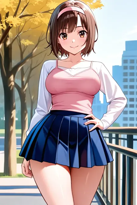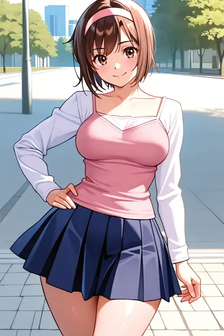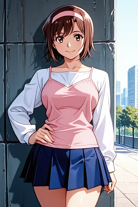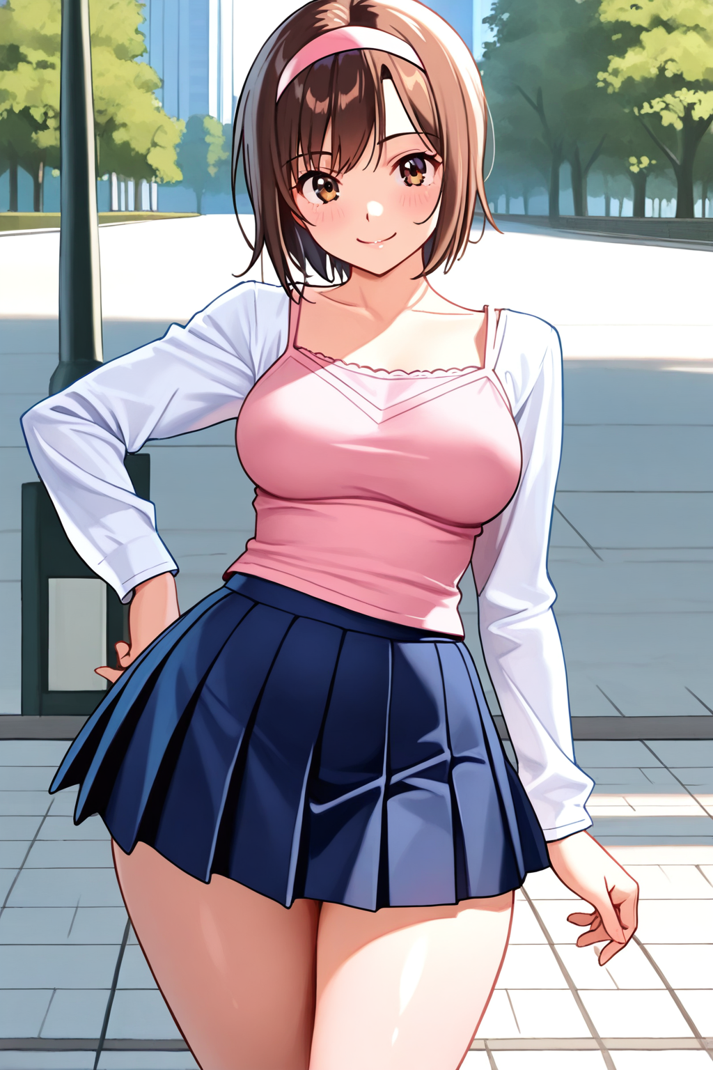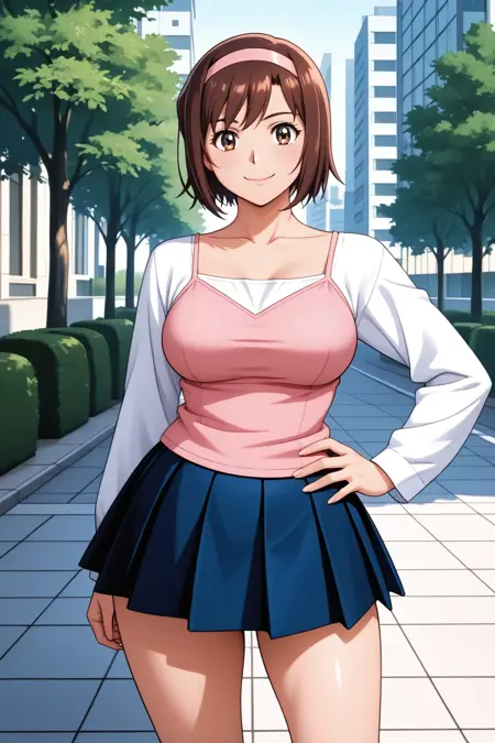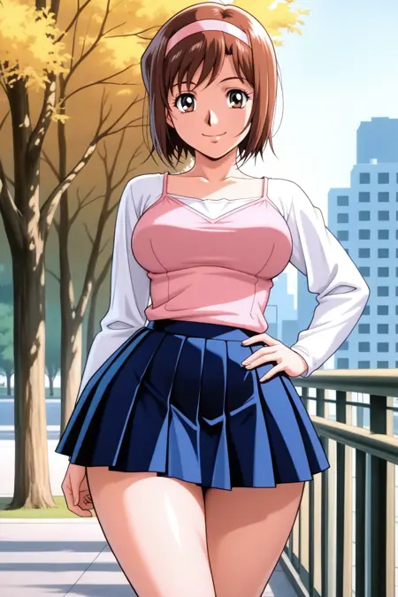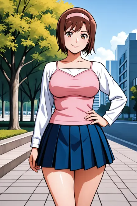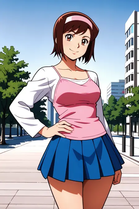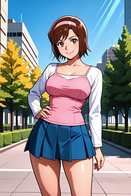 衣装: ピンクのヘアバンド、 ピンクのカミソール、 白いシャツ、 青いスカート、および プリーツスカート。異なる衣装を希望する場合は、これらをネガティブプロンプトに記述してください。