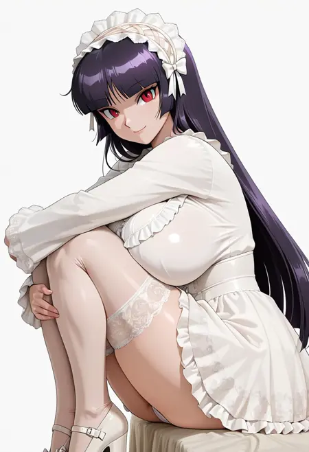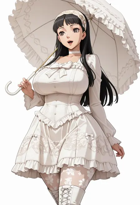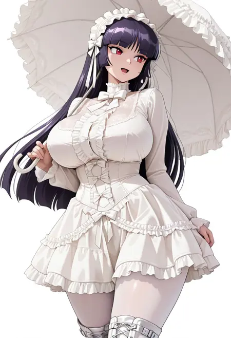 흰 플랫폼 긴 부츠, 흰 밀가루 프린트 팬티스타킹, 레이스, 파라솔,