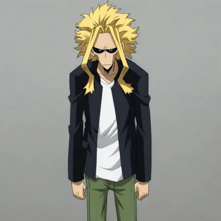 toshinori yagi, solo, male, adult, thin, skinny, black sclera blue pupils, short, long, messy yellow hair, two strands in a "V" shape pointing downwards, open black jacket, white shirt, green pants, black shoes
