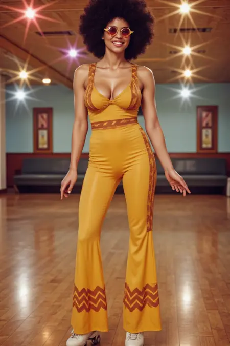 A collection of women wearing various fashion styles and clothing from the disco era of the 1970's