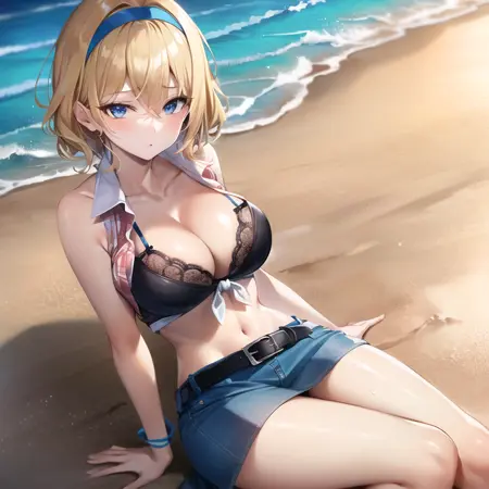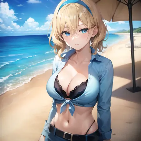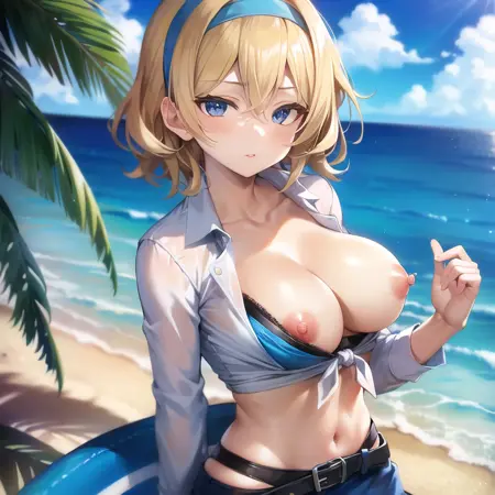 注意: 不要使用 "FRONT-TIE TOP"!!! 另外,使用 "shirt pull" 来表现胸部突出,无论是否穿内衣都有效;"nipples" 有助于表现裸露!"shirt pull, bra:0.5" 可以帮助表现穿内衣时胸部突出的效果。
