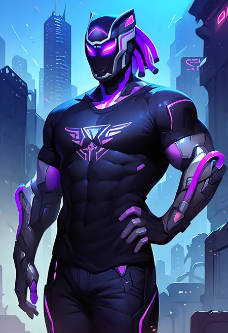 트리거 태그: C0y0te, cyborg, sharp claws, grey armor, sharp ears, glowing purple accents, black visor, purple eyes, glowing blue core, purple dreadlocks, forearm purple cable