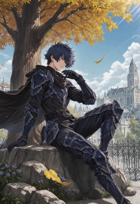 cape, armor, black shirt, belt, gauntlets, pants, armored boots,