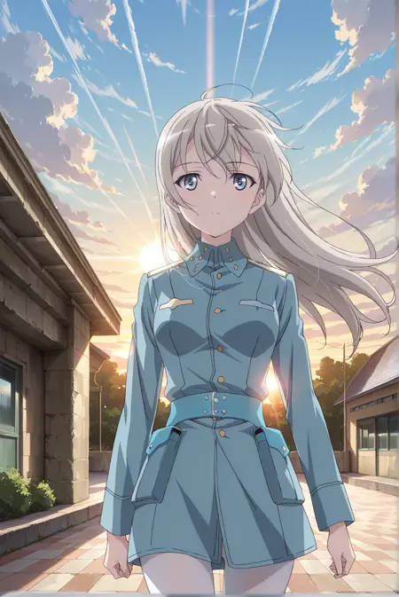 服装:elila,默认,1girl,蓝眼睛,银发,长发,制服,军装,蓝色夹克,军用夹克,白色连裤袜,蓝色腰带