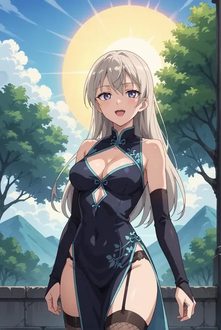 衣装:elila、デフォルト、1girl、青い目、銀髪、長い髪、ユニフォーム、軍服、青いジャケット、軍用ジャケット、白いパンティストッキング、青いベルト