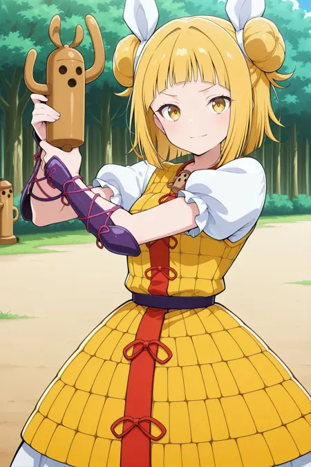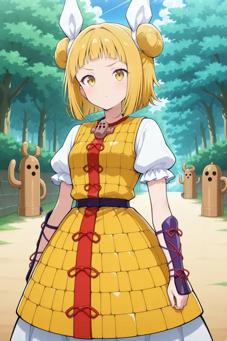 joutouguu mayumi, 1girl, solo, yellow eyes, blonde hair, double bun, small breasts,