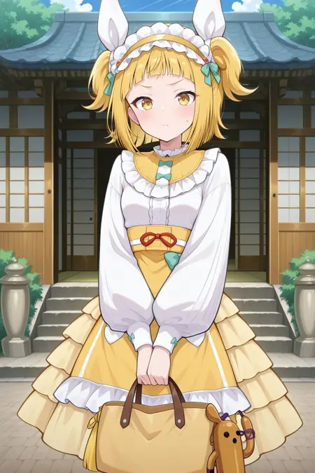 joutouguu mayumi, 1girl, solo, yellow eyes, blonde hair, twintails, small breasts,, joutouguu mayumi \(haniwa's been good all year\), alternate costume, white ribbon, frilled hairband, yellow hairband, white shirt, long sleeves, frilled shirt collar, mary janes, waist apron, yellow apron, green bow, yellow skirt, frilled skirt, white socks, yellow shoes, holding bag,