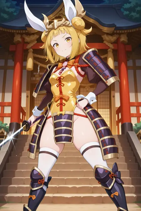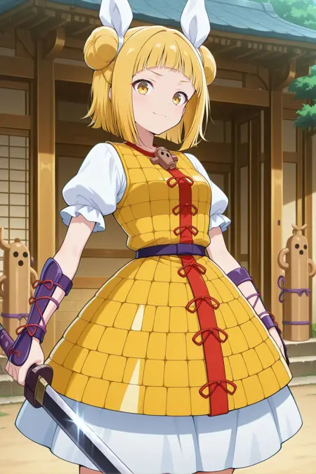 joutouguu mayumi, 1girl, solo, yellow eyes, blonde hair, double bun, small breasts, joutouguu mayumi \(ceramic bunny rookie\), alternate costume, animal ears, rabbit ears, rabbit tail, gold crown, necklace, orange bowtie, yellow leotard, armored leotard, samurai, detached sleeves, black sleeves, long sleeves, white thighhighs, armored boots, black boots, japanese armor, holding sword,