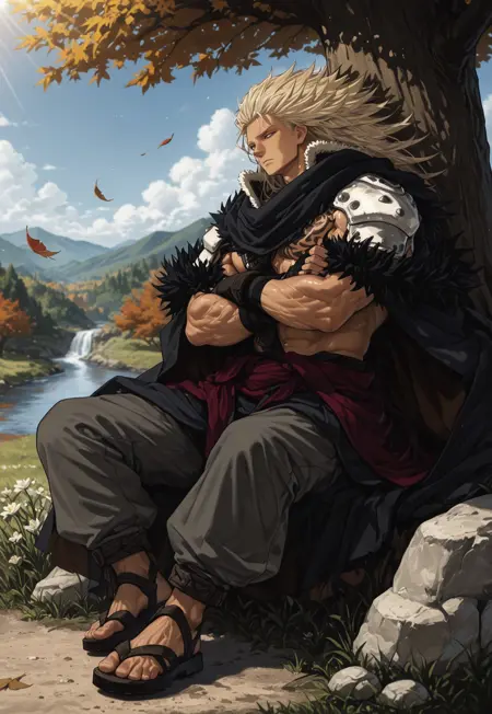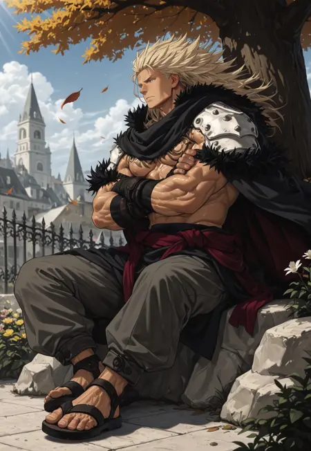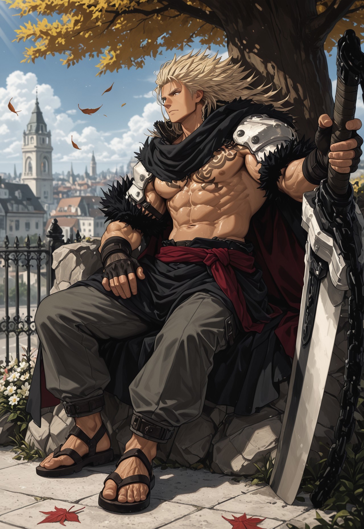 cape, pauldrons, shirtless, fur trim, sash, chest tattoo, chain, pants, sandals, fingerless gloves,