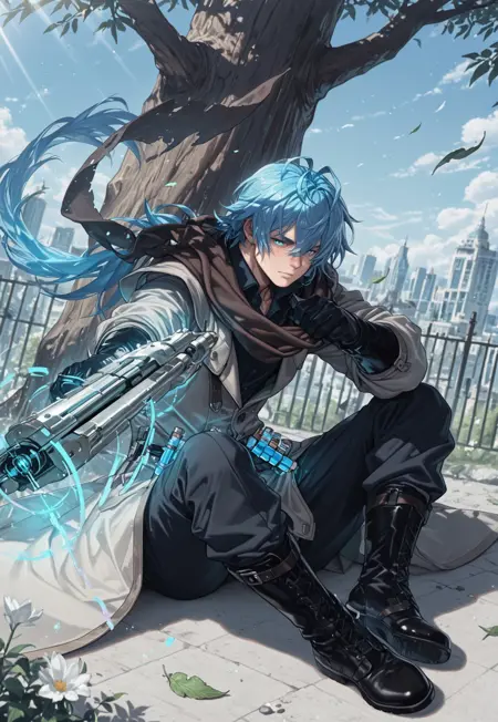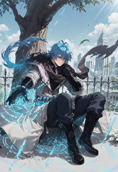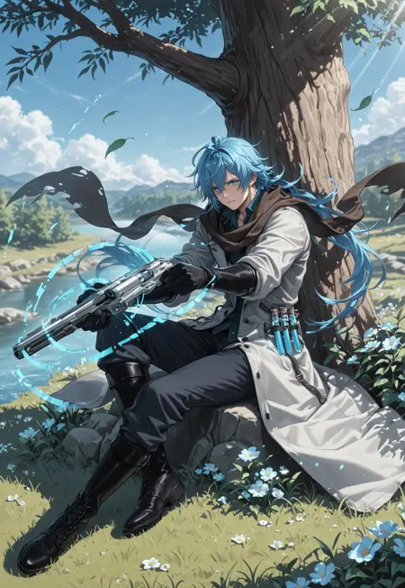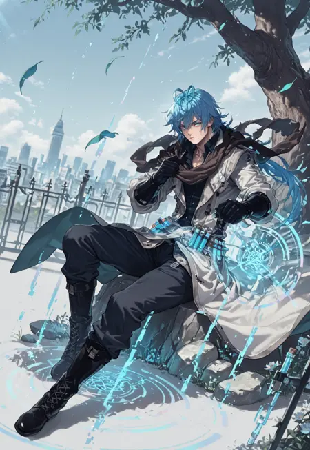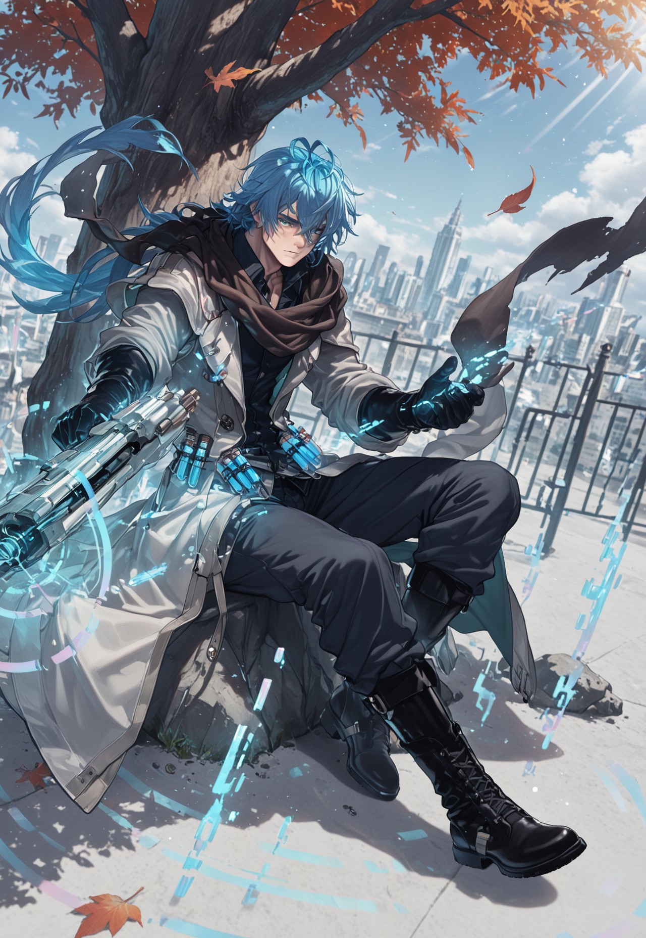 collared shirt, scarf, gloves, coat, glowing, pants, boots, vial,