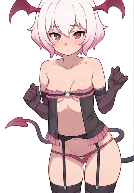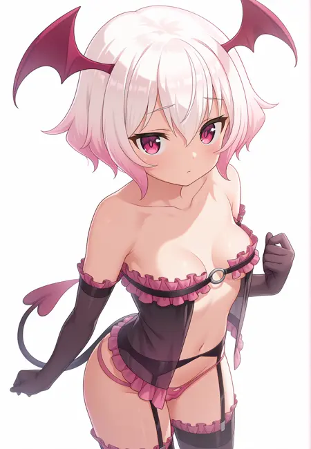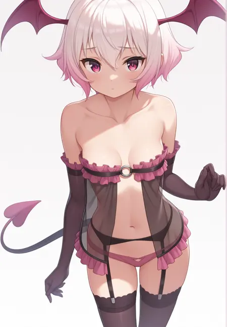Lolisa-Liver020, 1girl, solo, short hair, pink eyes, pink hair, gradient hair, white hair, small breasts, demon girl, head wings, thighhighs, gloves, navel, bare shoulders, collarbone, black gloves, elbow gloves, black thighhighs, garter straps, lingerie, o-ring, garter belt, pink panties, panties on top, lace, lace thigh highs, see-through clothes, see-through, navel, cleavage, bare shoulders, collarbone, stomach, bare hips, thin panties, demon wings in head