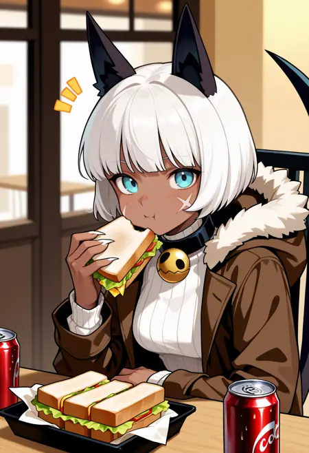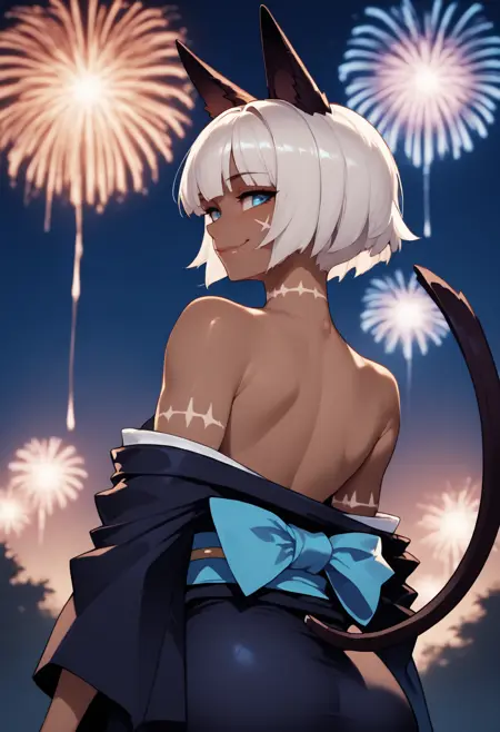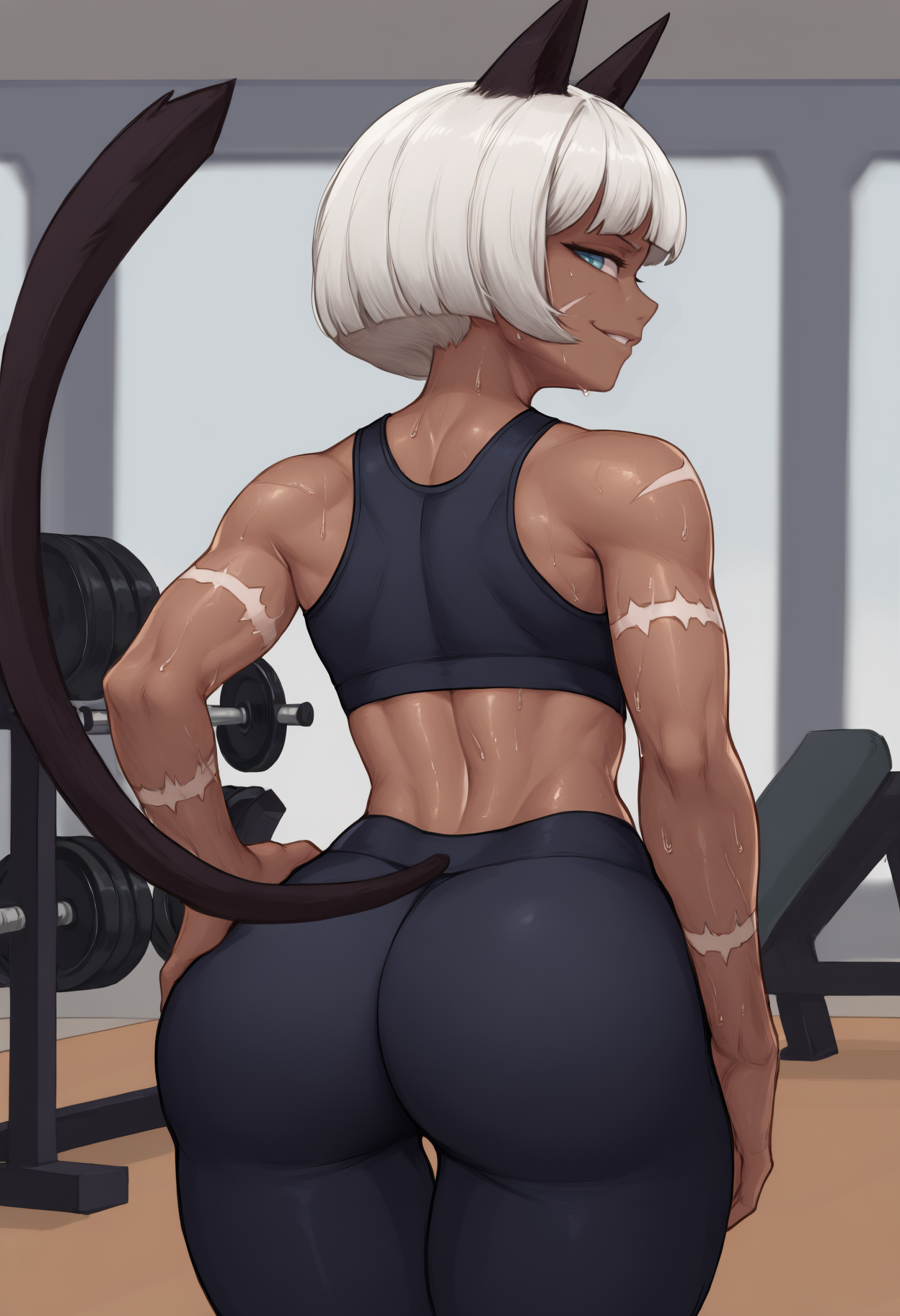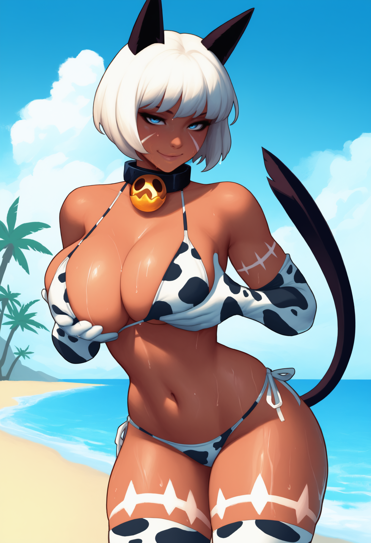 Appearance: dark-skinned female, scar on cheek, scar on arm, scar on leg, claws, sharp toenails, cat tail, short hair, white hair, bob cut, animal ears, blue eyes