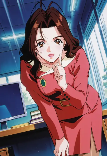 Base: aoigpx, 1girl, retro artstyle, anime coloring, solo, long hair, antenna hair, brown hair, black hair, brown eyes, wavy hair, lips, lipstick, aoi red dress, belt, pencil skirt, red skirt, long sleeves, brown pantyhose, medium breasts,