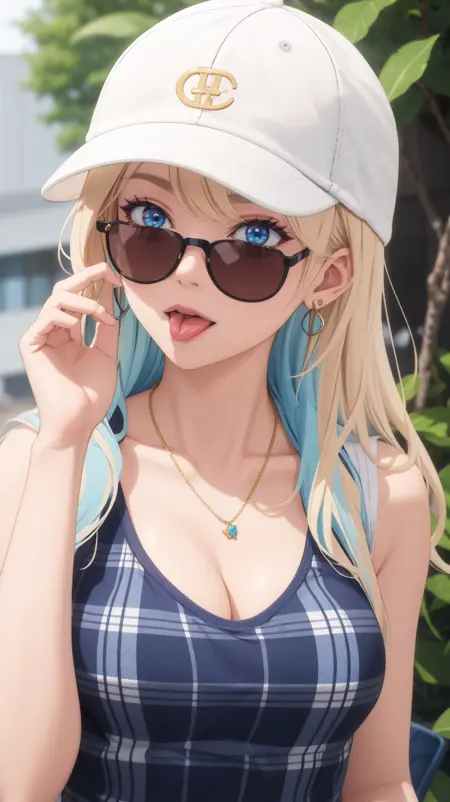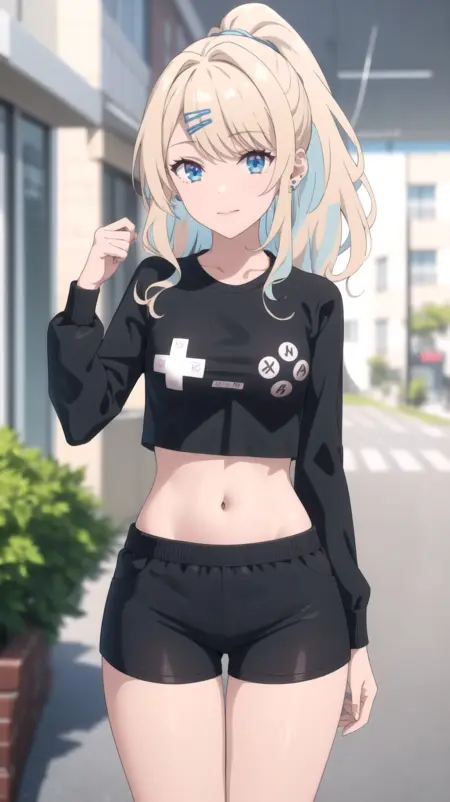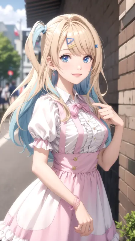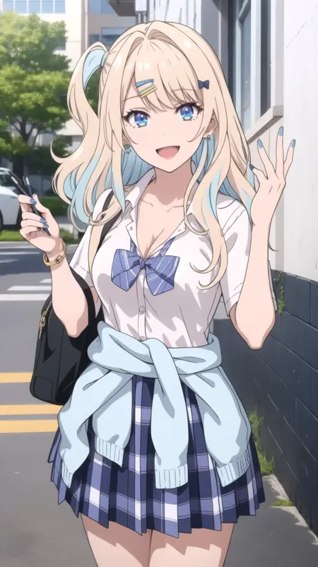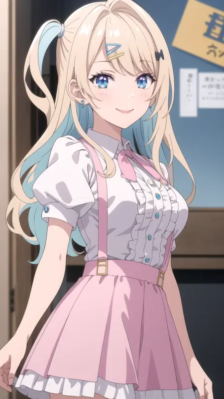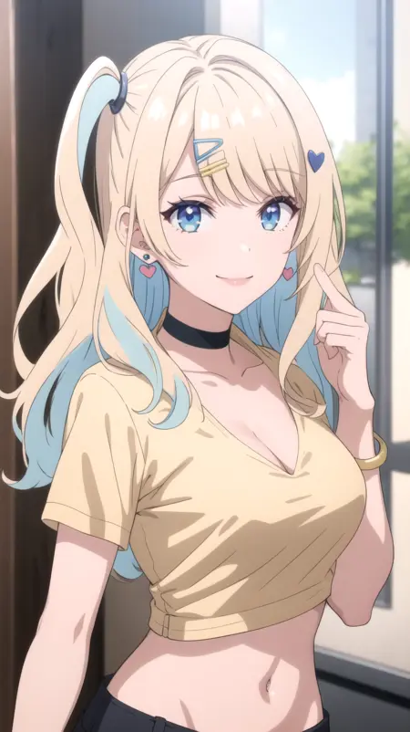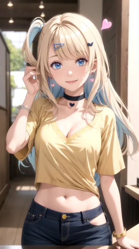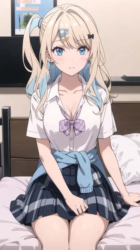 트리거 캐릭터: ShirakawaRuna, 1girl, 금발, 다색 머리카락, 앞머리, 한쪽만 위로, 긴 머리, 파란 눈, 헤어클립, 보석, 귀걸이, 중간 크기 가슴, gyaru