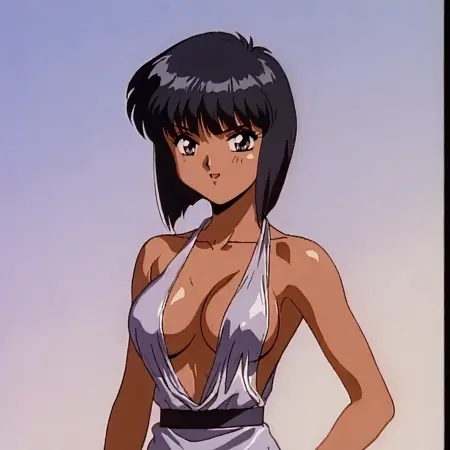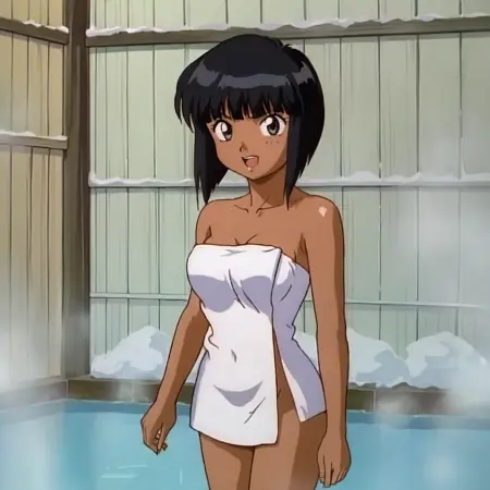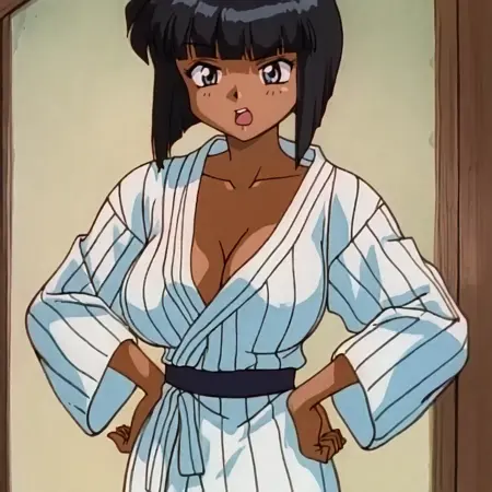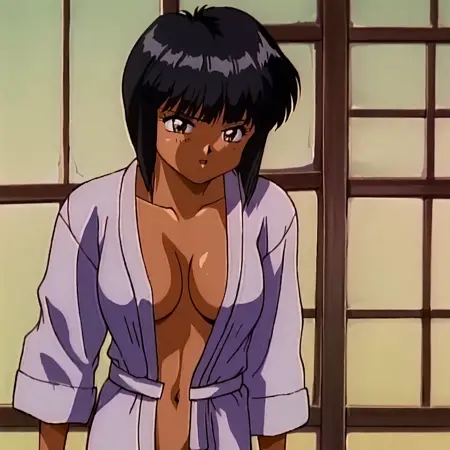 유카타 트리거: MitakaYukata, 1girl, 큰 가슴, 검은 피부 여자, 검은 피부, 검은 머리, 단발, 흉선, 둔한 앞머리, 보브컷, 목욕 가운, 레트로 아트스타일, 견갑골, 두기, 카우보이샷