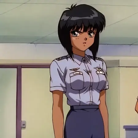 셔츠 트리거: MitakaShirt, 레트로 아트스타일, 1girl, 경찰복, 1990년대 (스타일), 검은 머리, 여경, 단발, 연필스커트, 두더지점, 1980년대 (스타일), 짧은 소매, 카우보이샷