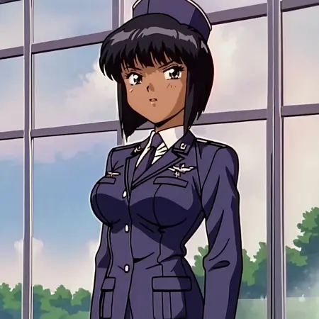 모자 착용 트리거: Mitaka, 1girl, 긴 소매, 검은 머리, 모자, 단발, 연필스커트, 검은 피부 여자, 넥타이, 검은 피부, 레트로 아트스타일, 보브컷, 검은 눈, 군복, 가슴, 재킷, 카우보이샷