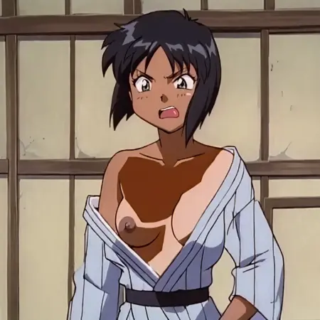 반노출 복장 트리거: MitakaHalfNude, 1girl, 중간 정도 가슴, 검은 머리, 검은 젖꼭지, 검은 피부, 검은 피부 여자, 단발, 브라 없음, 기모노, 일본 옷, 어깨 드러난, 카우보이샷