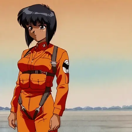비행기 복장 트리거: MitakaAirplaneOutfit, 1girl, 검은 머리, 레트로 아트스타일, 주황색 점프슈트, 단발, 보브컷, 1980년대 (스타일), 검은 피부 여자, 군복, 1990년대 (스타일), 앞머리, 검은 눈, 카우보이샷