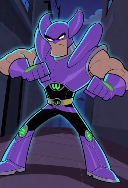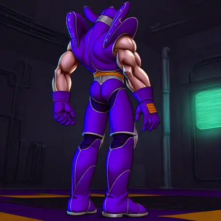 标签: U_L_JN,紫色面罩,紫色盔甲,肌肉发达,无袖,紫色手套,紫色靴子。为避免“面罩”下嘴巴消失,可能需要明确指定表情