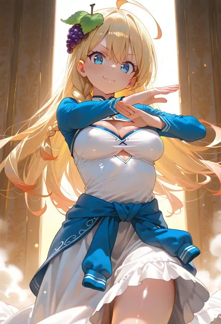 Iris Stylish-Sword Belzerg from Konosuba, blue eyes, blonde hair, long hair, single braid, grape hair ornament, ahoge, small breast, white dress, long dress, layered dress, jewelry, cleavage cutout, blue clothes tied around the waist,