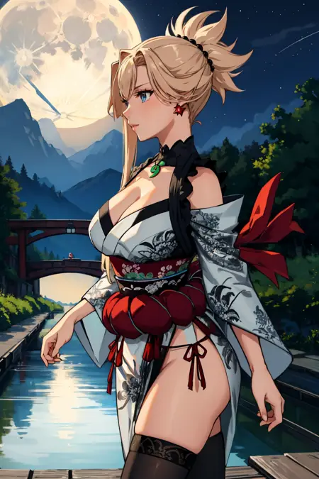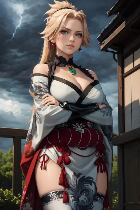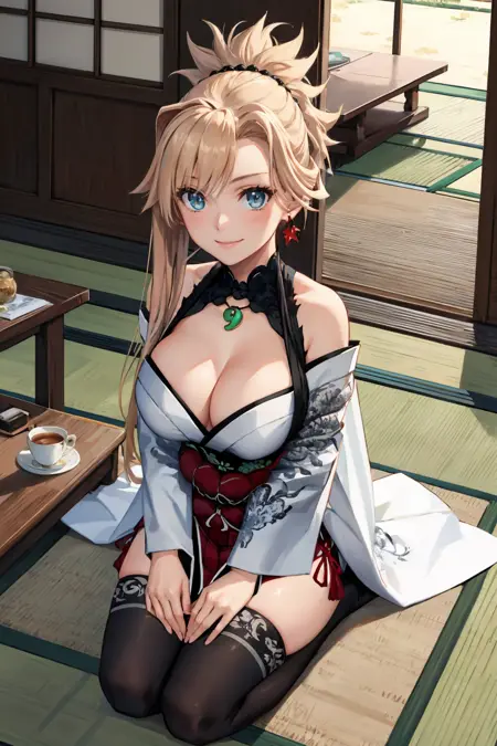为了呈现她典型的外观,请添加 "发饰、项链、耳环、白色和服、胸脯露出、腰带、黑色过膝袜"。
