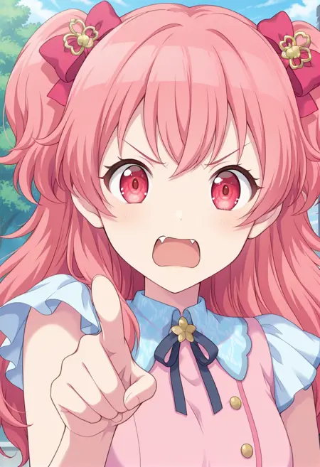 服装:1个女孩,粉发,长发,两侧高束,裙子,红眼,白色鞋履,手腕 cuffs,蝴蝶结,粉眼,靴子