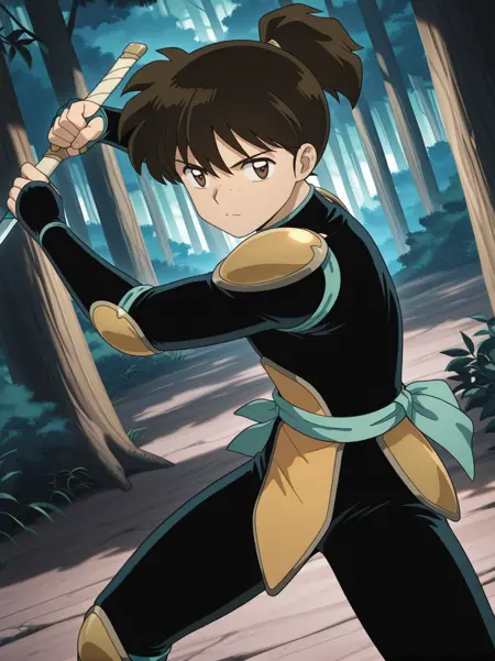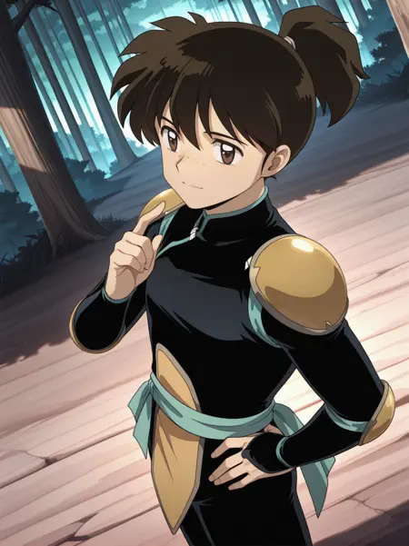 Main Words: "brown hair, ponytail, brown eyes, freckles, black bodysuit, armor, shoulder armor, green sash, elbow pads, knees pads"
