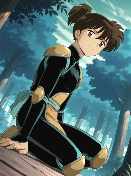 主要ワード:"茶色の髪、ポニーテール、茶色の目、そばかす、黒のボディスーツ、アーマー、肩アーマー、緑の帯、肘当て、膝当て"