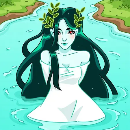 1girl,dark teal hair,very long hair,leaf hair ornament,aqua skin,red eyes,off-shoulder dress,white dress,long dress