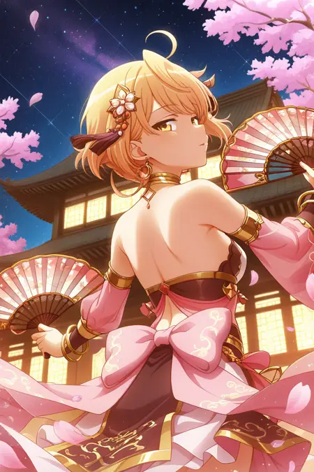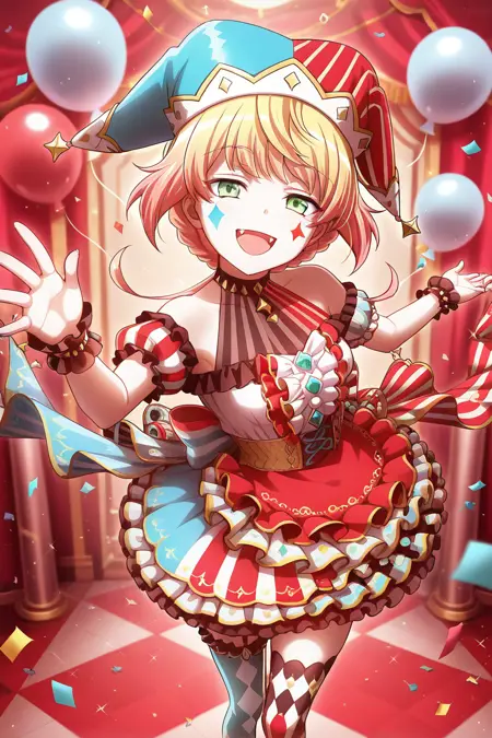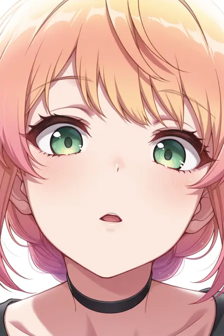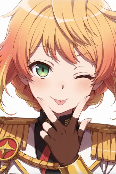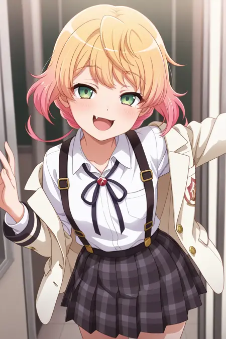 minku, 1girl, solo, green eyes, gloves, smile, fingerless gloves, gradient hair, multicolored hair, blonde hair, black gloves, looking at viewer, pink hair, epaulettes, ahoge, skirt, uniform, orange hair, dress, braid, stage outfit