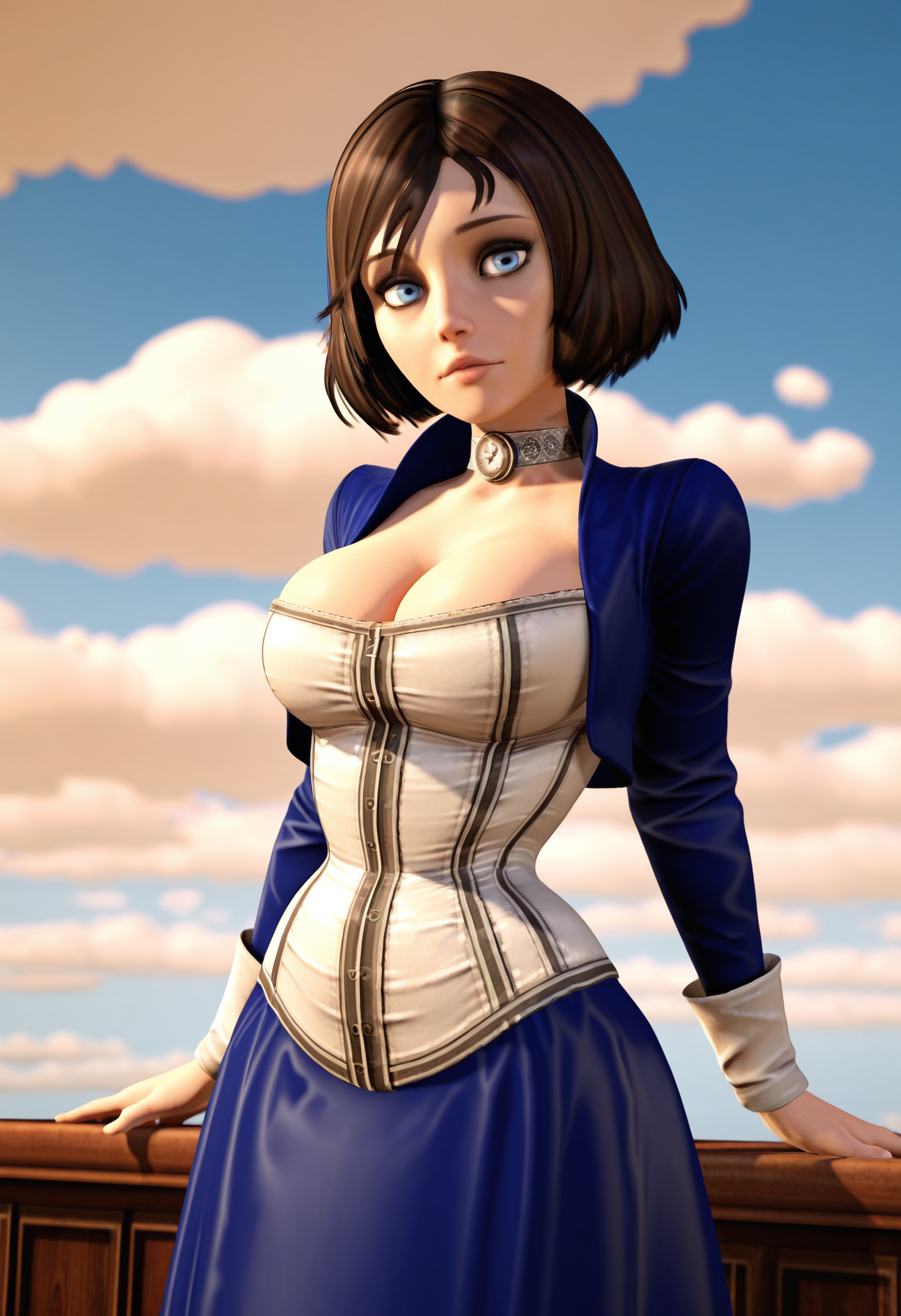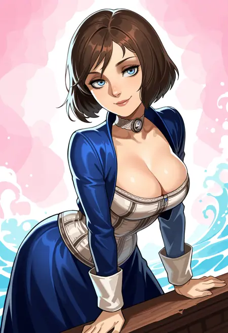 V1アクティブワード:elizabethwaifuIL、茶色の髪、青い目、白いシャツ、チョーカー、低いポニーテール、青いスカート、ネッカチーフ、ロングスカート、まつげ、