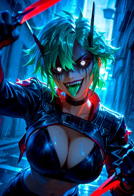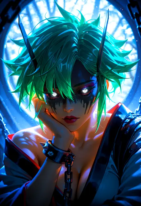 1girl, 天线, 妆容, 面部彩绘, 阴影面部, 眼袋, 凌乱口红, 彩色虹膜, 黑色虹膜, 白色眼睛, 发光眼睛, 凌乱头发, 尖刺头发, 不同发型, 绿色头发, 不同发色, 短发, 短马尾, 头发在眼睛之间, 刘海, 头饰, 巨大胸部, 宽臀, (粗大腿:1.2), 机械尾巴,