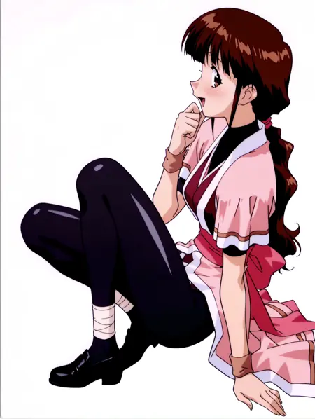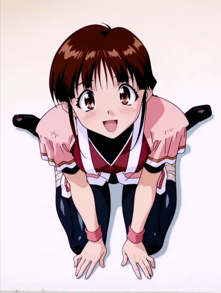 服装词:y_clothes、long hem、short_sleeves、wristband、black_pantyhose、bandaged legs、black footwear