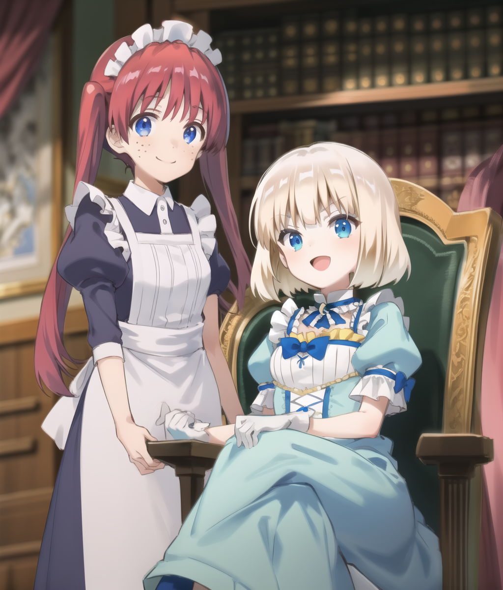 Liora, maid apron, black dress, juliet sleeves, hair ornament, leaf hair ornament