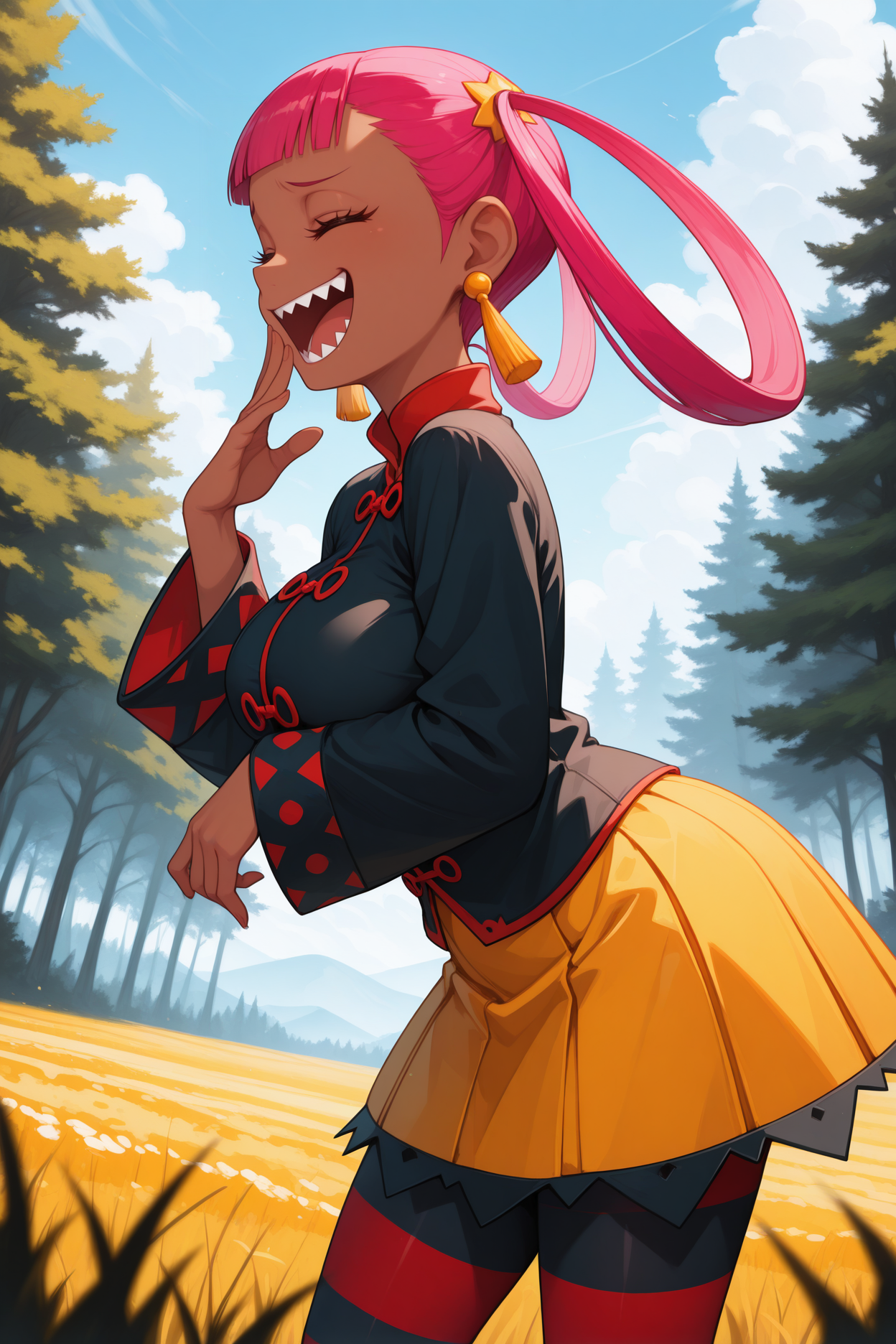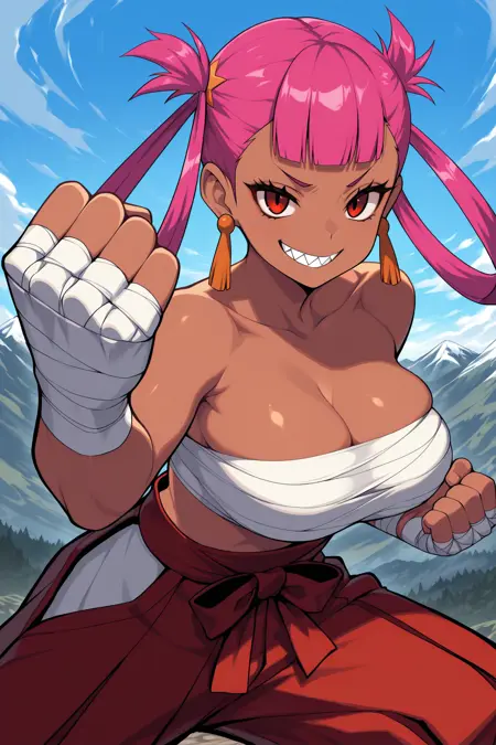 トリガー単語は「pkmpk」であり、「濃い肌の女性、ピンク色の髪、髪のリング、まっすぐな前髪、赤い目、まつげ、鋭い歯」が必要です。