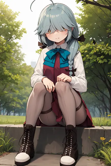 トリガー:hamanami \(kancolle\), ahoge, hair ribbon, single braid, (hair over shoulder, hair over eyes, hair over one eye, )