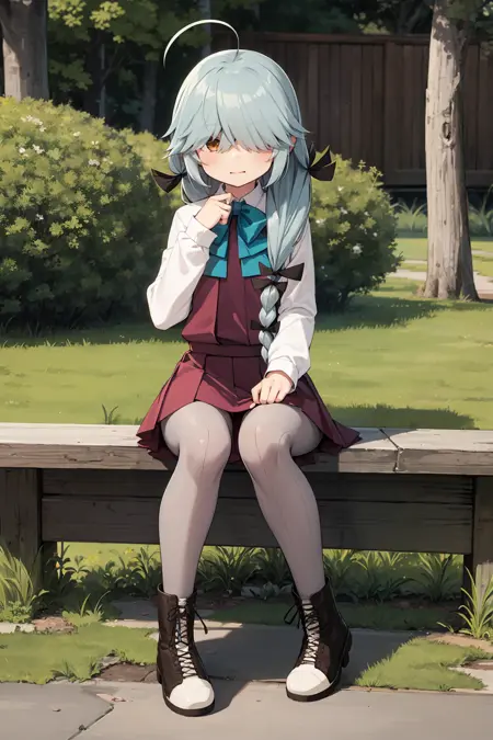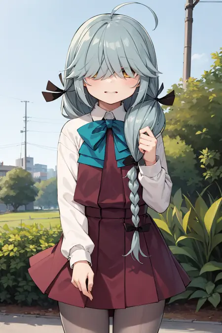 キャラクター:hamanami \(kancolle\), ahoge, hair ribbon, single braid, (hair over shoulder, hair over eyes, hair over one eye, )