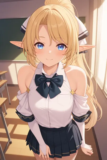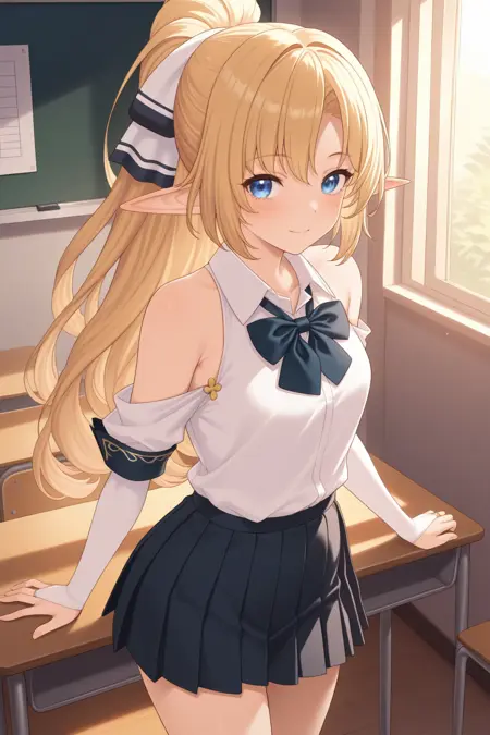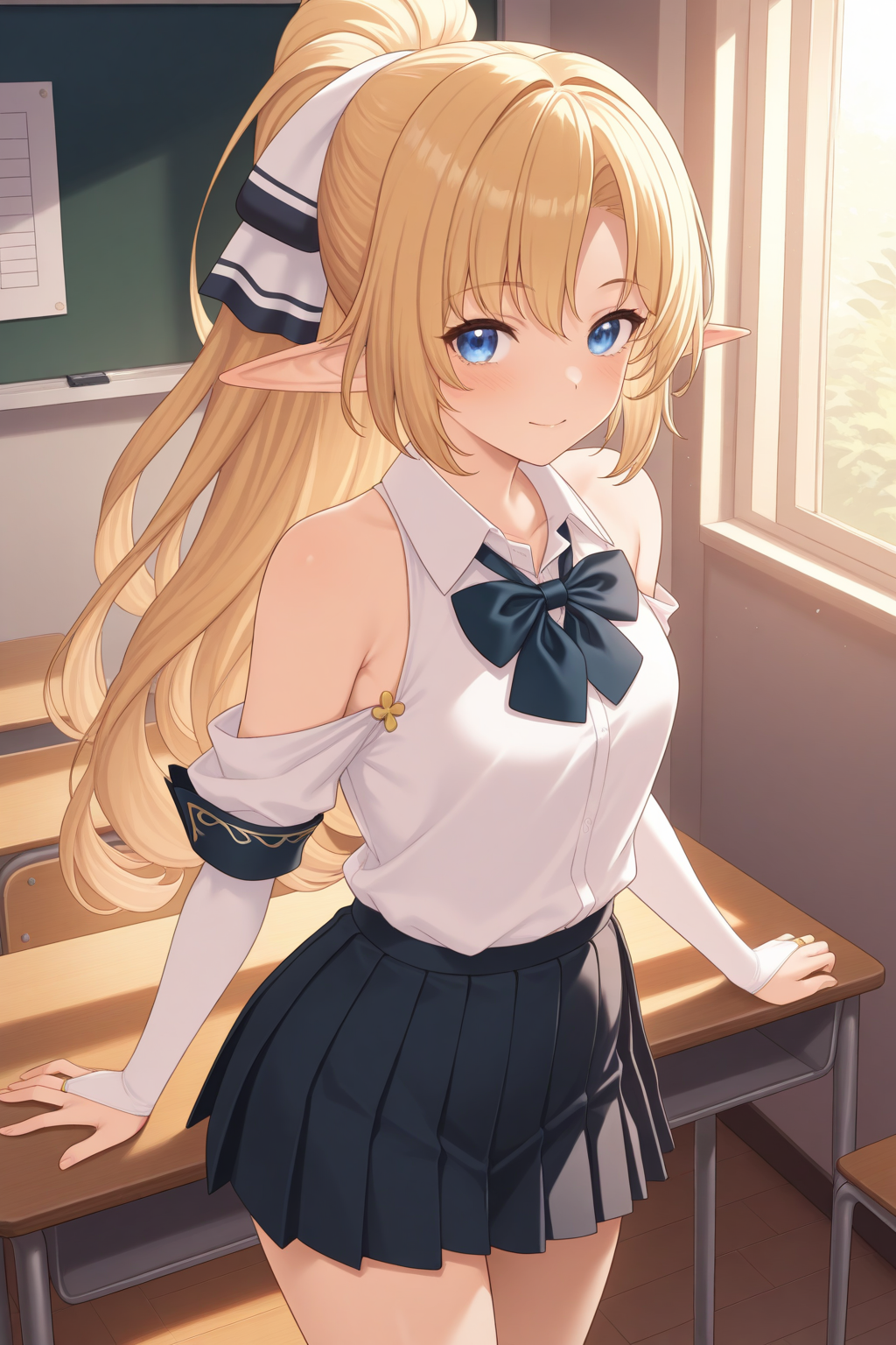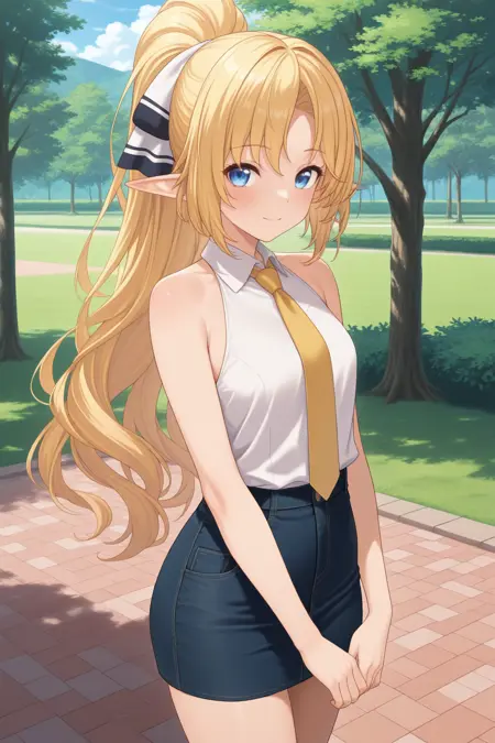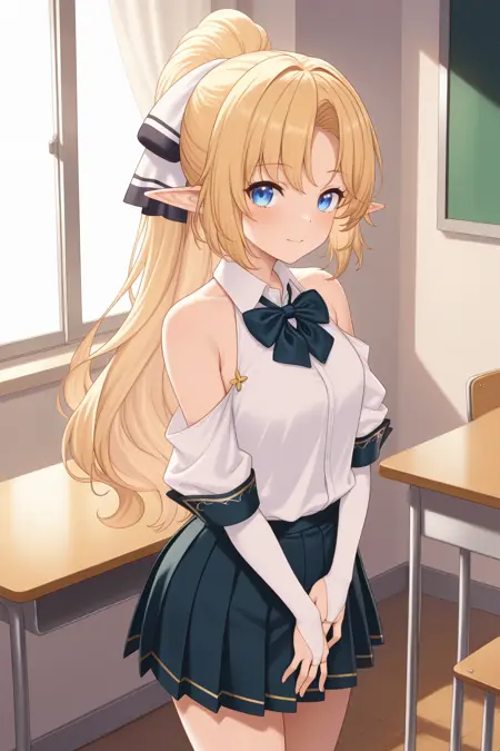 aairis, elf, pointy ears, blue eyes, blonde hair, ponytail, white hair ribbon, irisdef, blue bowtie, white dress shirt, short sleeves, shoulder cutout, bridal gauntlets, blue skirt, pleated skirt,
