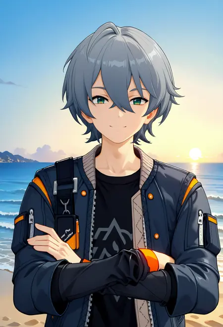 タグ:zhe、衣装:zheのジャケットと黒いシャツ、1人の少年、緑の目、灰色の髪