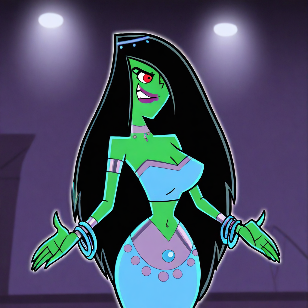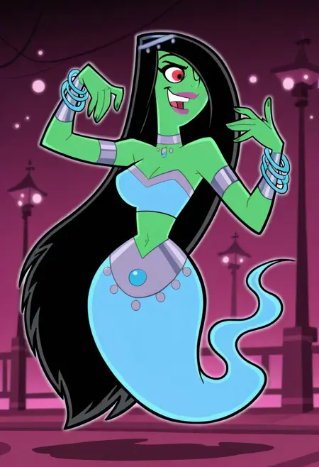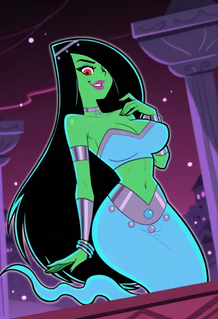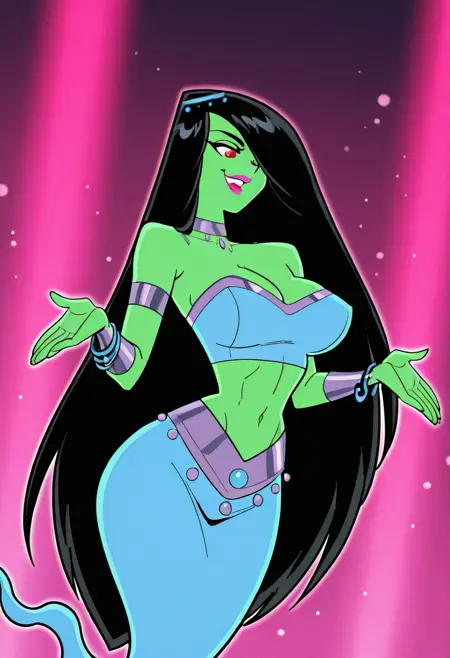 DesireeMS, 1girl, solo, monster girl, ghost, genie, colored skin, green skin, very long hair, black hair, hair ornament, hair over one eye, red eyes, lips, lipstick, makeup, choker, large breasts, light blue bandeau, cleavage, navel, midriff, groin, belt, jewelry, ghost tail, vambraces, arabian clothes, strapless, bare shoulders,