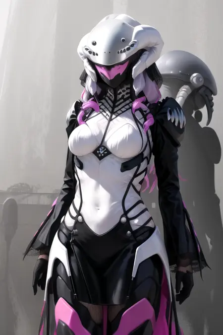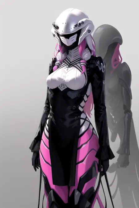 NephilaKingohger, 1girl, solo, long sleeves, black dress, medium breasts, pink hair, purple hair, mask, colored skin, helmet, monster girl, extra eyes, arthropod girl, alien