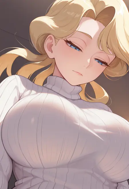glci, blue eyes, blonde hair, long hair, white choker, collarbone, large breasts, cleavage, purple dress, puffy sleeves, long sleeves, white gloves, mature female