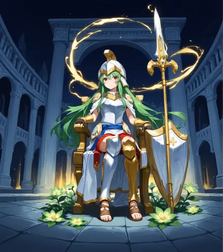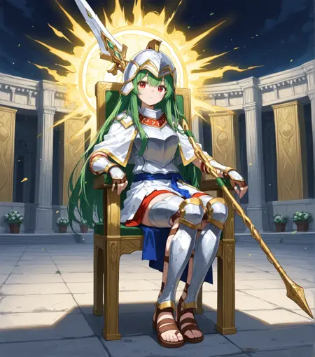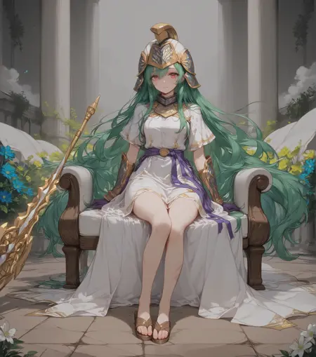 solo, long hair, green hair,red eyes, white metal helmet with golden trim and green, armor, athena, gloves, long_hair, green_hair, spear, white shield with wing design and adorned with golden trim and green flower design, purple belt, blue sash tied at waist, white metal leg guards with brown sandals, white metal breastplate, dress with golden trim and green flower design alongside it