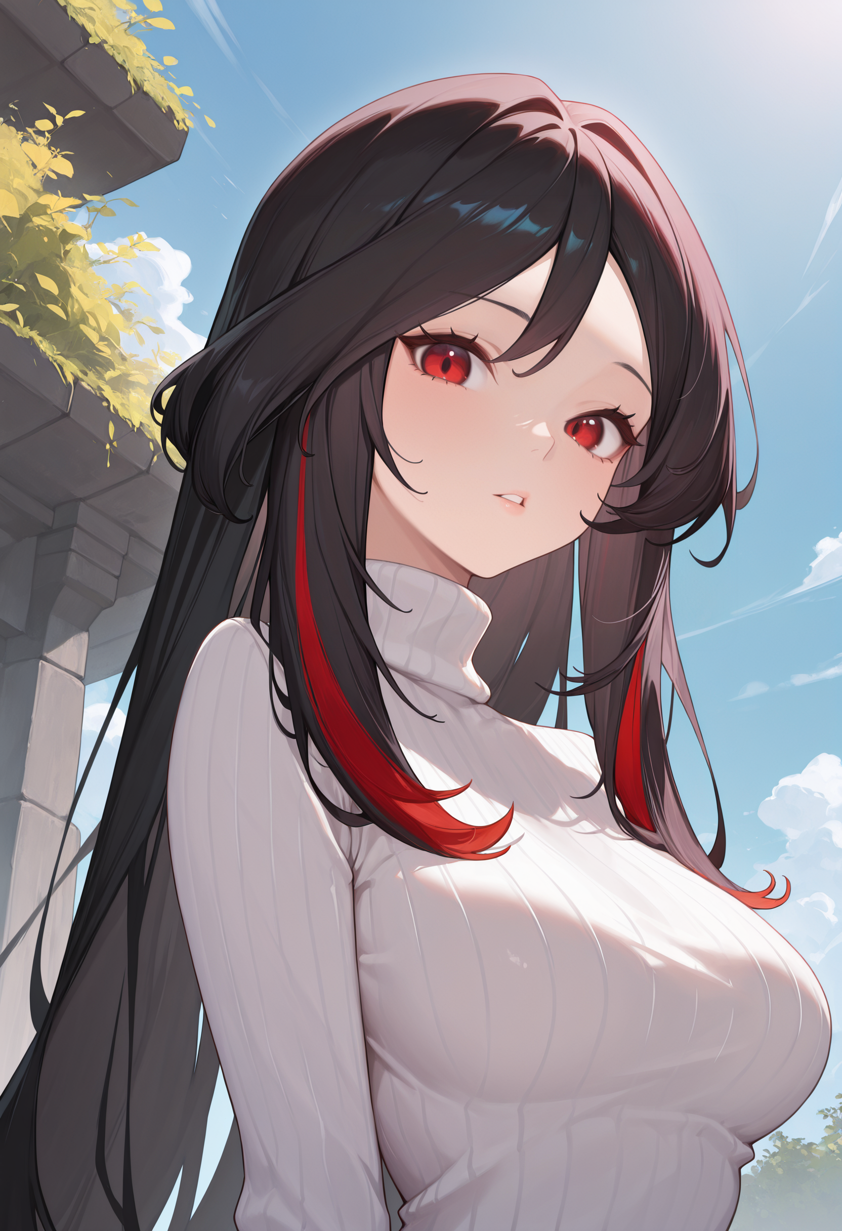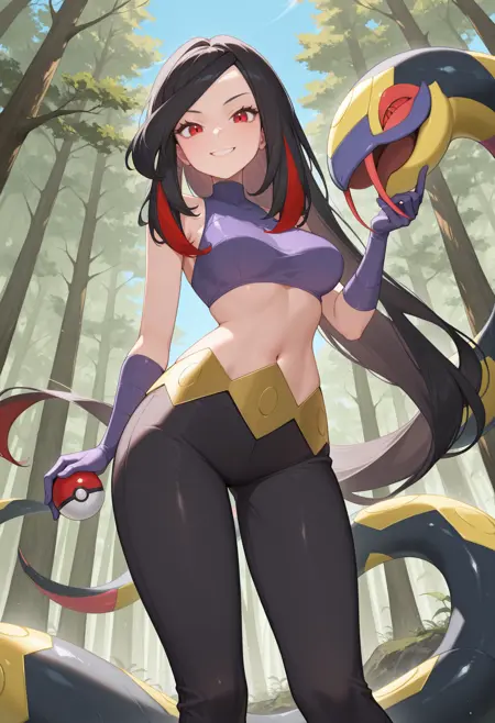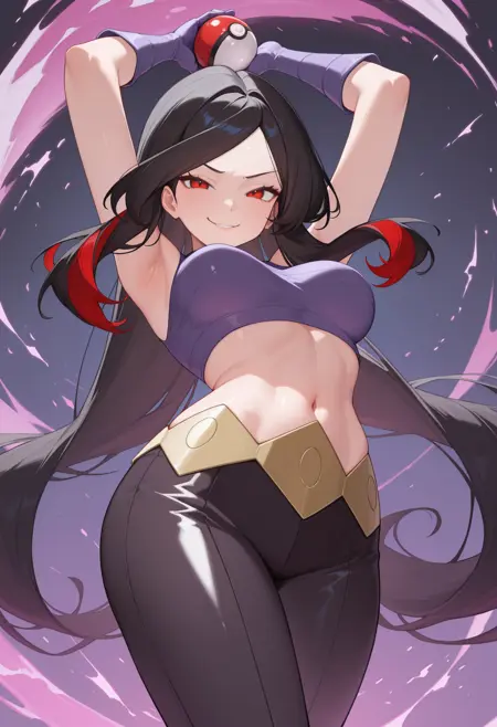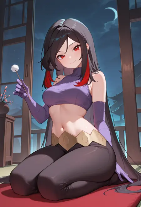 lcy,红眼睛,黑发,极长发,多色发,红发,中等胸部,紫色上衣,露脐装,无袖,腹部,肚脐,黑色紧身裤,紫色手套,肘部手套