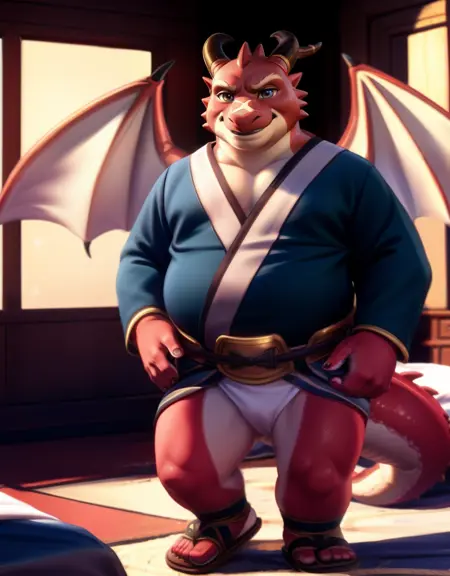 관련 단어: 붉은 피부, 드래곤 날개, 드래곤 뿔, 드래곤 꼬리, 파란 망토, happi, 열린 셔츠, 모래신발