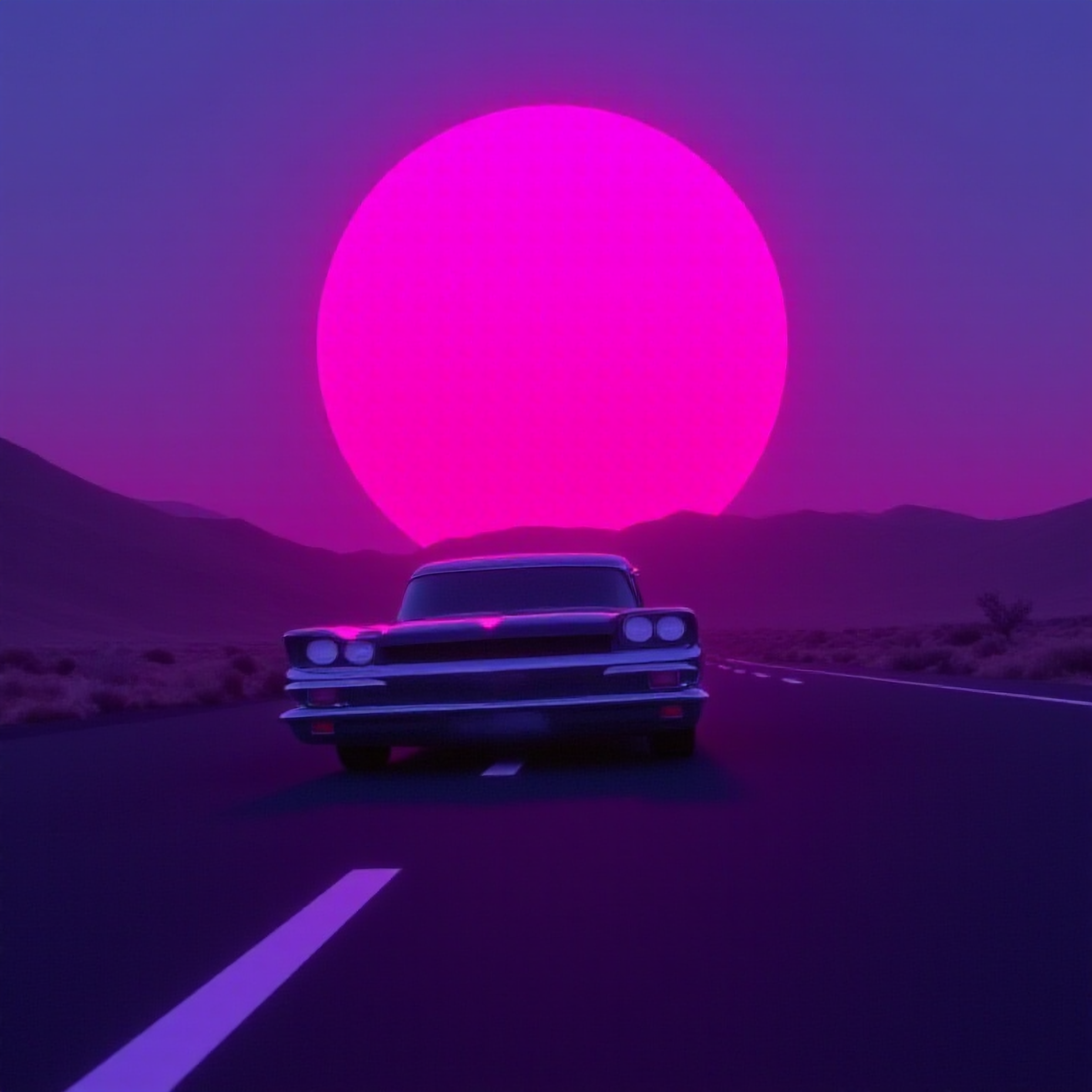 khanette, vaporwave, lofi, A retro car parked on a deserted road under a large pink sun. The scene features vibrant purple and blue gradients creating a surreal atmosphere. The composition emphasizes the car's sleek lines against a dramatic landscape. Highlights and shadows add depth and mood.