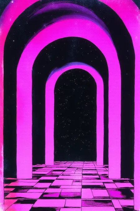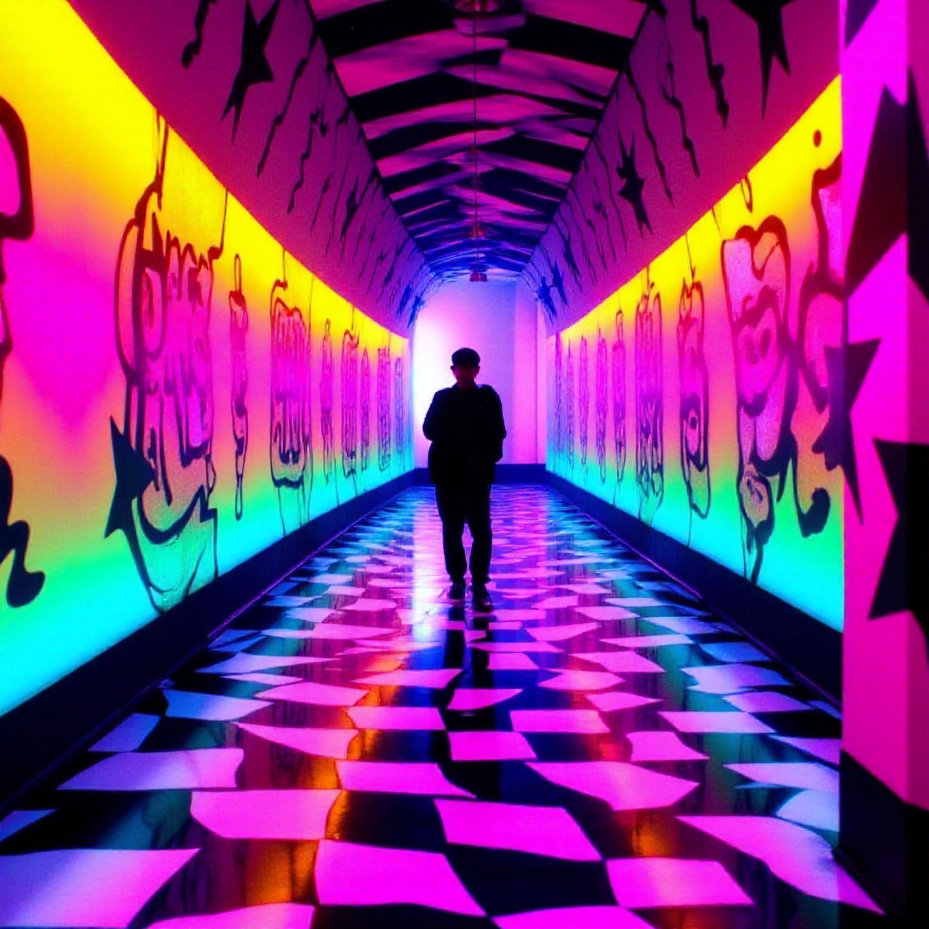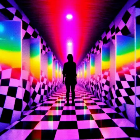 khanette, vaporwave, lofi, A striking black-and-white checkered hallway with vibrant, psychedelic color gradients on the walls. A silhouetted figure stands centrally, enhancing depth. Soft, diffused lighting creates a surreal, dreamlike atmosphere. Influences of pop art and optical illusion styles are evident.