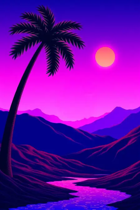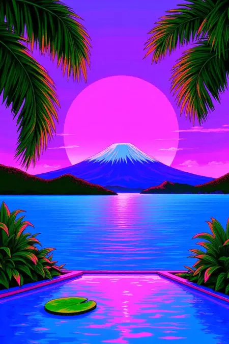 khanette, vaporwave, lofi, A vibrant tropical landscape at dusk features a palm tree with a pink trunk against a surreal purple and blue sky. A large, glowing pink suns hover in the distance, casting colorful reflections on the water. Pixel art style evokes a nostalgic retro vibe.